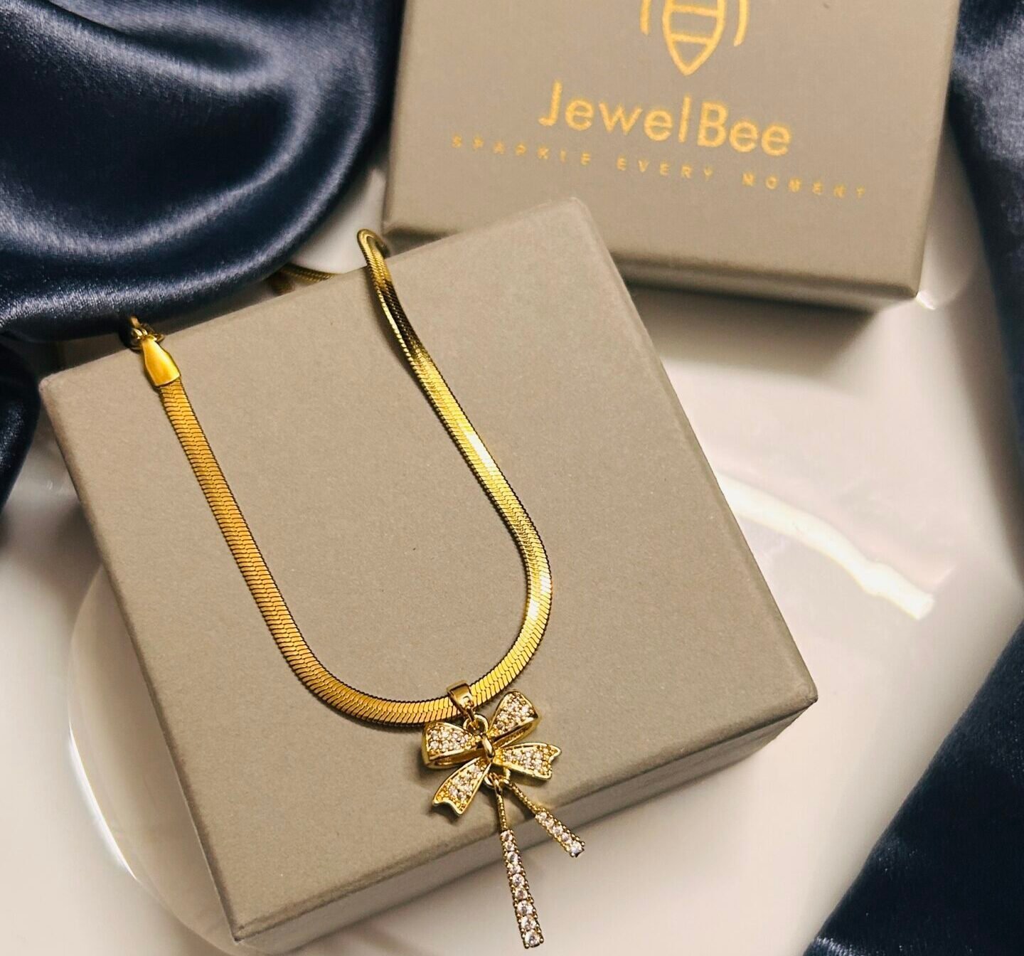 A graceful snake chain paired with a bow-shaped pendant adorned with AD stones, finished in 18K gold plating. Hypoallergenic, tarnish-resistant, and perfect for a touch of sparkle and elegance.