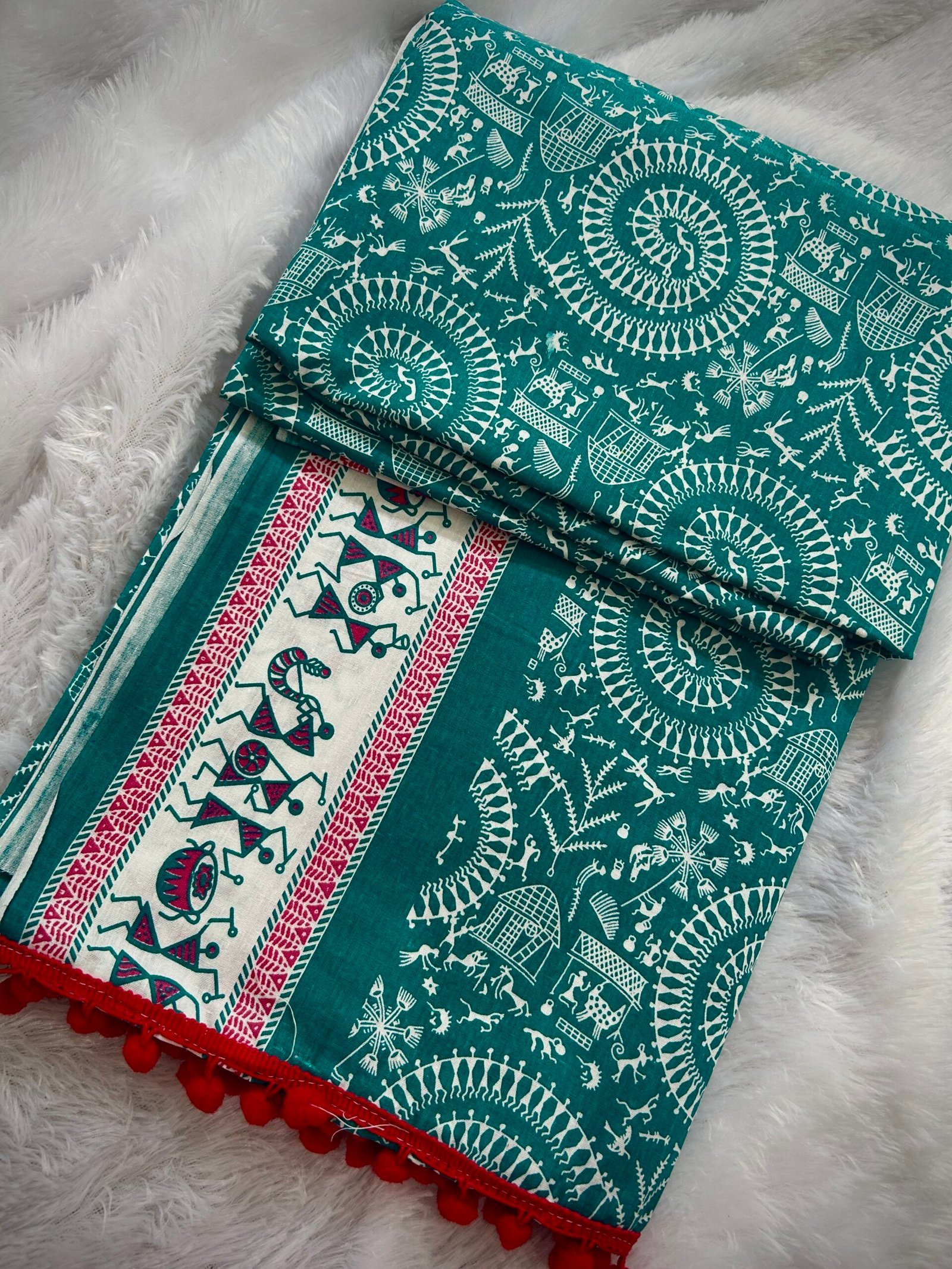 Cotton Kalamkari Folk Print Saree With Red Tassels